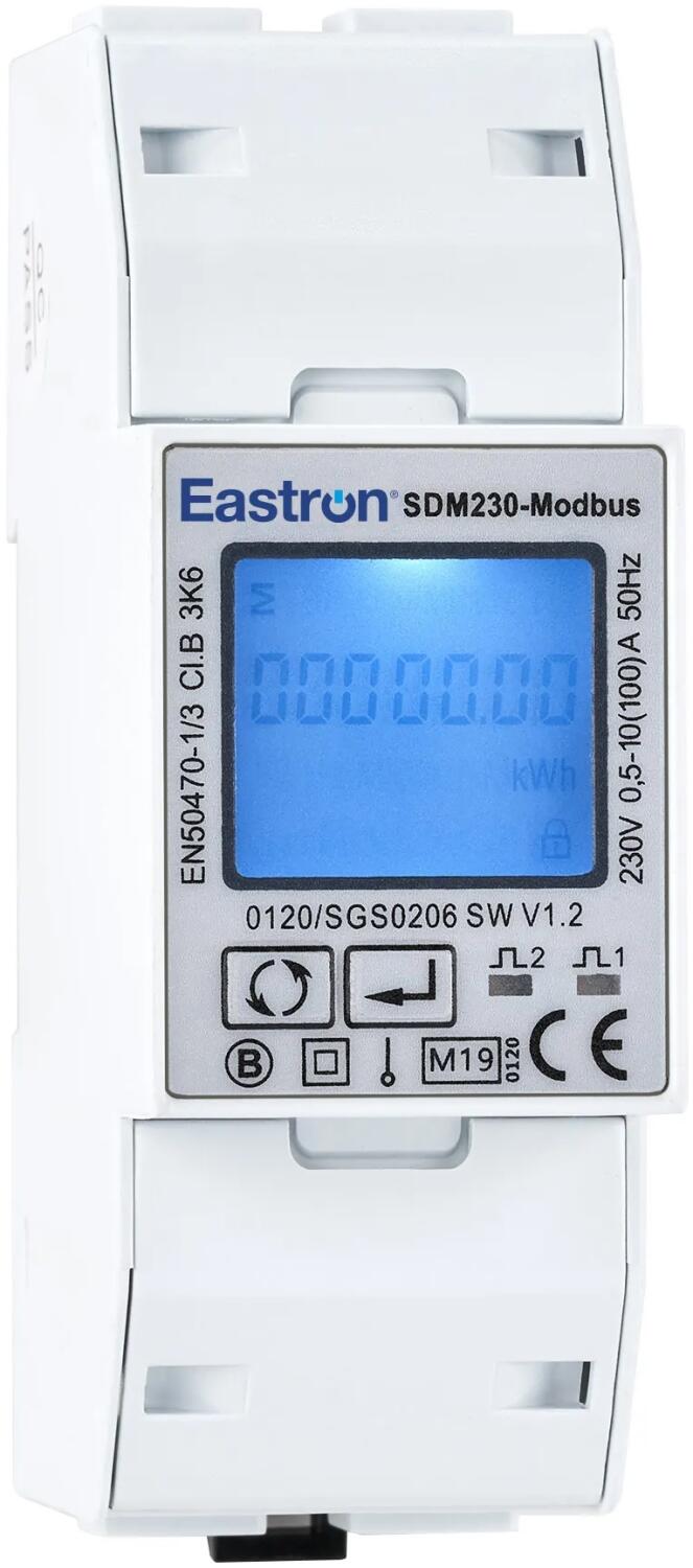 The Eastron SDM230 is a 100A, single phase energy meter with bi-directional energy measurement ideal for Solar PV metering. With a Modbus communication port, the unit allows for remote monitoring and can measure a wide variety of parameters. The blue back-lighted LCD screen for prefect reading makes this device suitable for industrial, residential, and utility applications.Measures kWh, Kvarh, KW, Kvar, KVA, PF, Hz, dmd, V, A, and moreBi-directional measurement IMP & EXPTwo pulse outputsDin Rail mounted100A direct connectedClass 1.0 accuracy 36mm width 2 moduleFor Solax X1, X1-AC and X1-Fit inverters only.